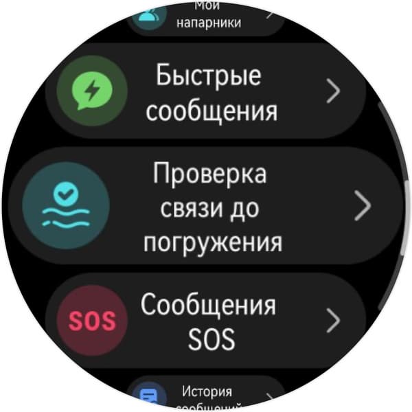 Находясь на глубине, можно отправить сообщение из шаблонов на расстояние до 30 метров (расстояние может быть меньше, если какие-то объекты оказываются между дайверами, а также если есть громкие посторонние звуки). Если включить функцию общения под водой, сигнал SOS будет пробивать до 60 метров.