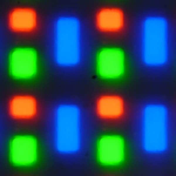 В этом экране используется OLED-матрица — активная матрица на органических светодиодах. Полноцветное изображение создается с помощью субпикселей трех цветов — красного (R), зеленого (G) и синего (B) в равном количестве, что подтверждается фрагментом микрофотографии: