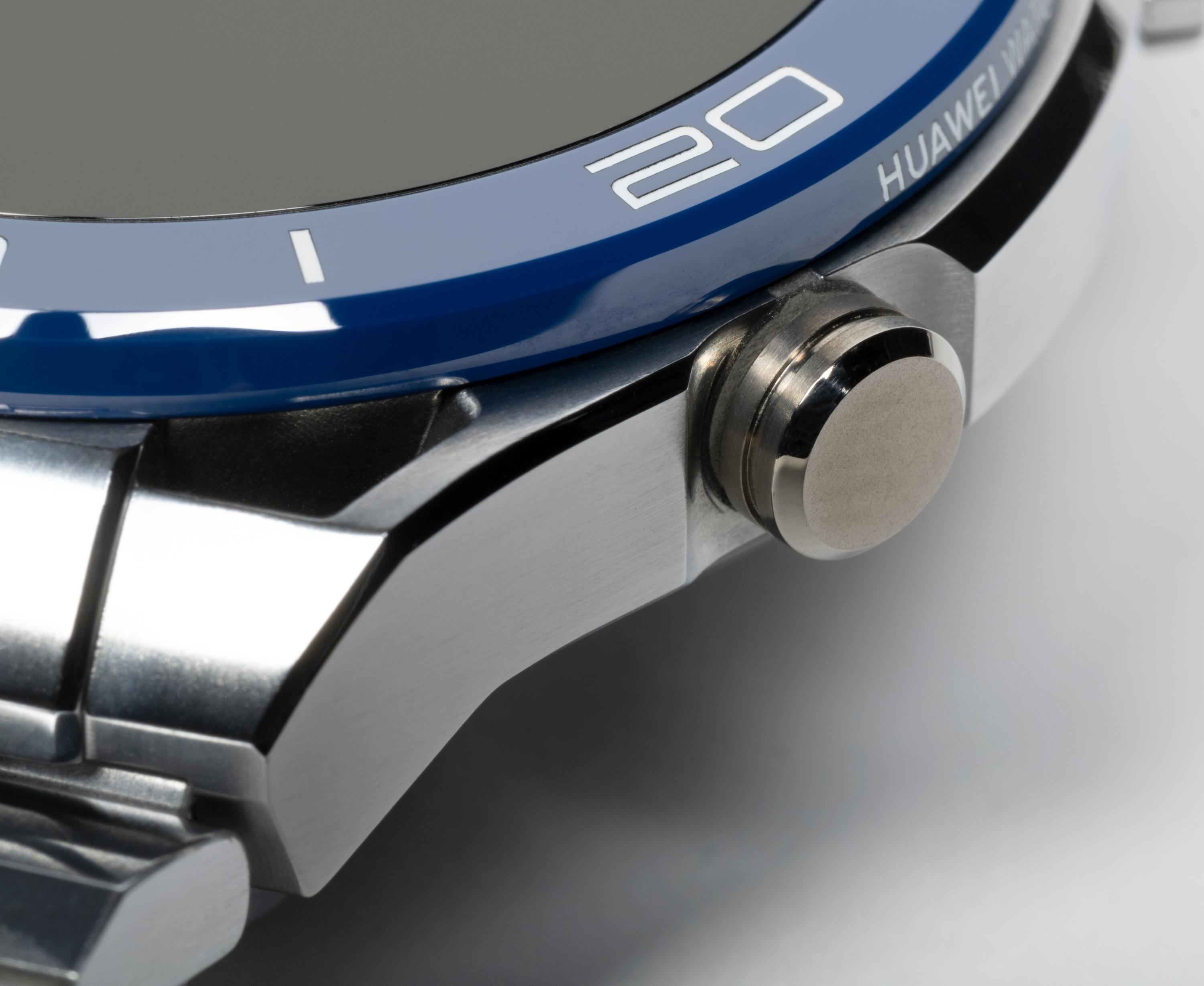 Часы Huawei Watch Ultimate выпускаются в двух цветовых вариантах — черном и сине-серебристом. У первого ремешок из каучука, у второго — из титановых звеньев. У нас на тестировании была сине-серебристая модель с титановым браслетом.