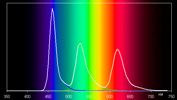 Спектры типичны для OLED — области первичных цветов хорошо разделены и имеют вид относительно узких пиков, перекрестное подмешивание цветов практически отсутствует: