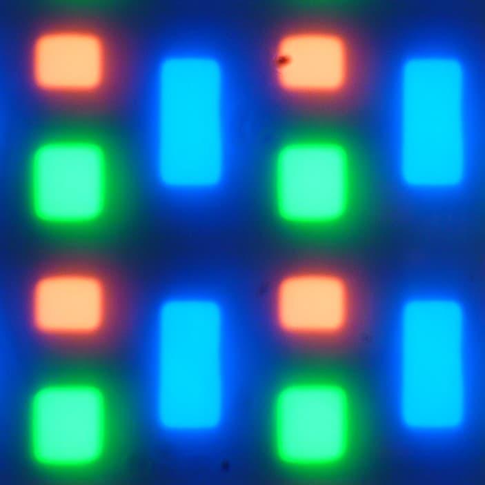 В этом экране используется OLED-матрица — активная матрица на органических светодиодах. Полноцветное изображение создается с помощью субпикселей трех цветов — красного (R), зеленого (G) и синего (B) в равном количестве, что подтверждается фрагментом микрофотографии:
