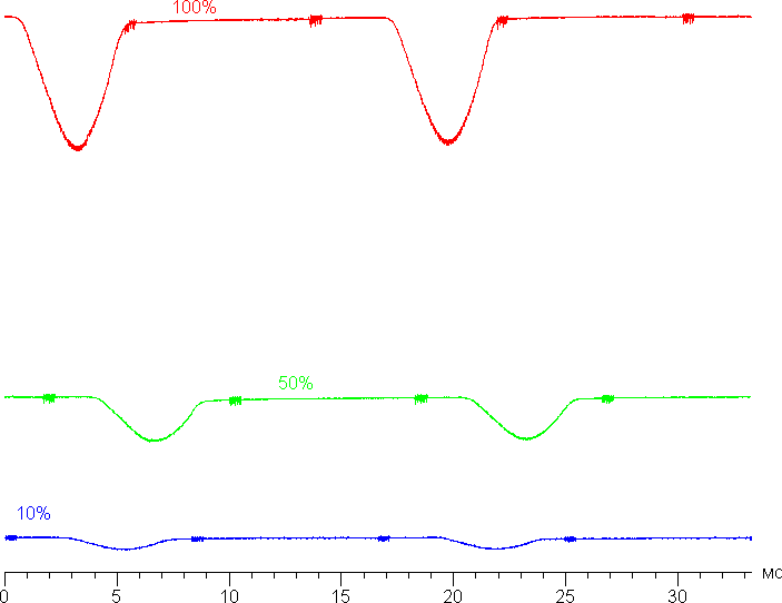 На графике зависимости яркости от времени определяется значимая модуляция с частотой 60 Гц, а при желании на некоторых изображениях при быстром движении часов относительно глаз можно выявить стробоскопических эффект. Однако по факту при обычном использовании мерцание не обнаруживается, так как фаза модуляции различается по площади экрана. На рисунке ниже приведены зависимости яркости (вертикальная ось) от времени (горизонтальная ось) для нескольких значений настройки яркости.