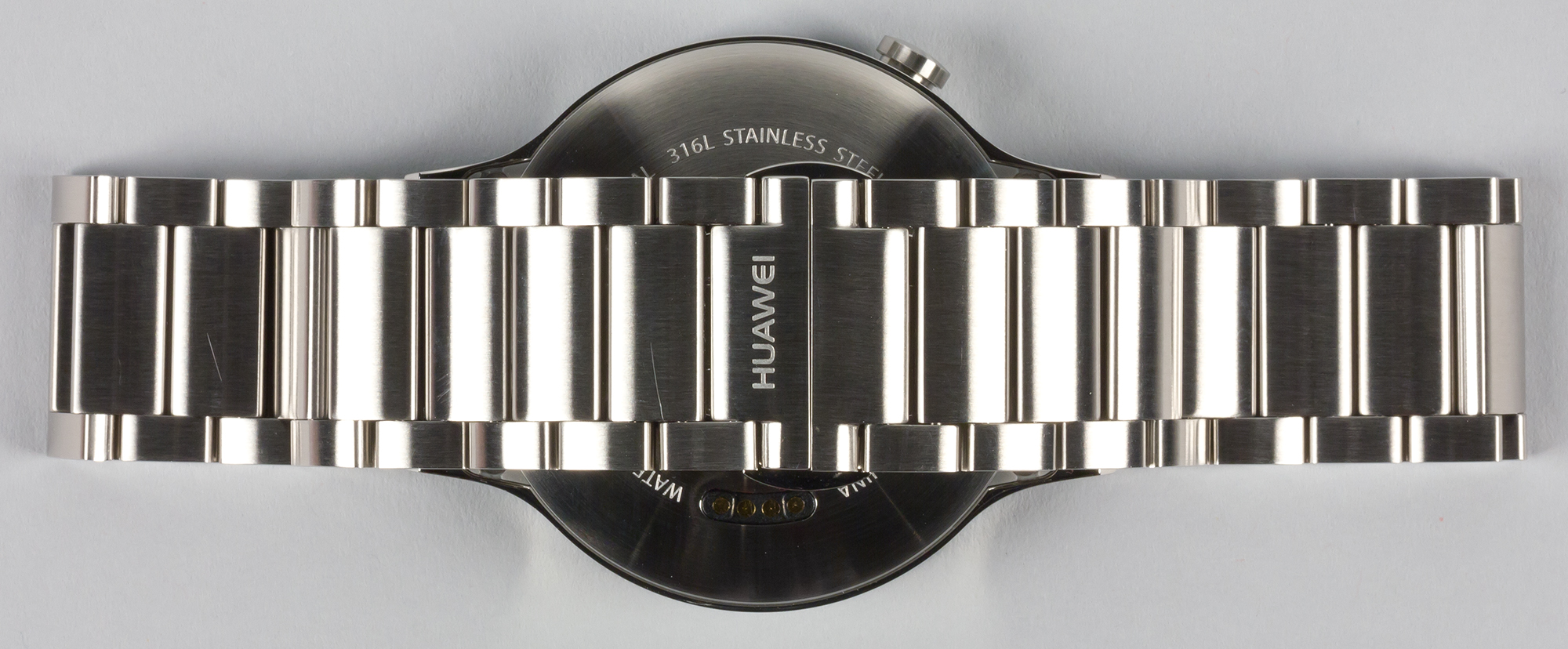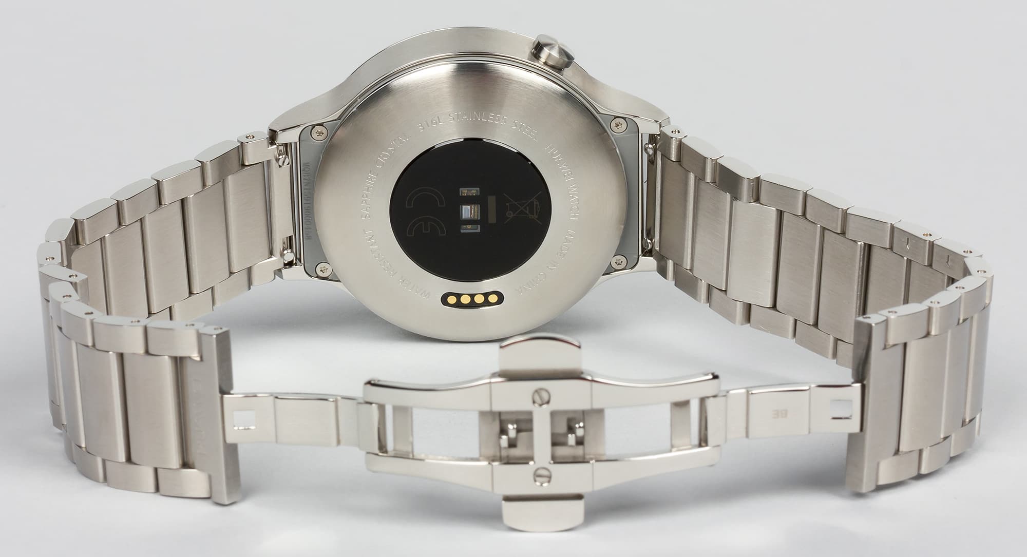 На тыльной стороне корпуса можно рассмотреть датчик сердечного ритма и контакты для подключения зарядного устройства. Показательно, что в отличие от Asus ZenWatch 2, где задняя поверхность выполнена из пластика (тогда как в остальном корпус металлический), у Huawei Watch даже тыльная сторона металлическая, а центральная зона, на которой расположен сенсор, сделана из стекла. По всей видимости, это сапфировое стекло — в характеристиках Huawei Watch указано Sapphire crystal, но именно в описании материалов корпуса, а не в отношении экрана. Какое стекло защищает экран, в официальных спецификациях не говорится. Одно можно сказать точно: пластика здесь нет ни грамма.