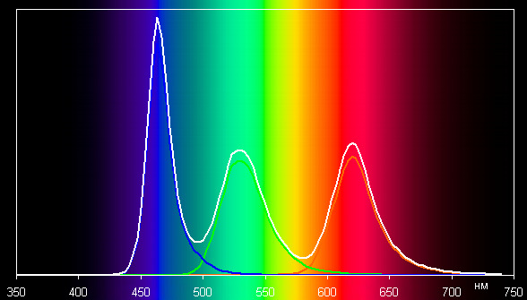 Спектры типичны для OLED — области первичных цветов хорошо разделены и имеют вид относительно узких пиков: