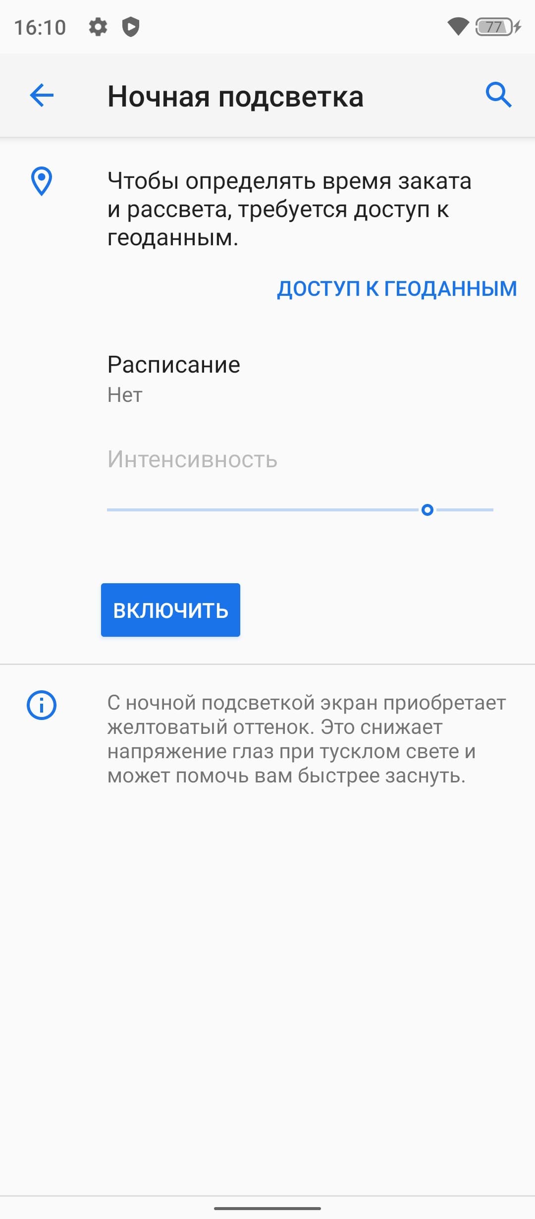 Также присутствует настройка, позволяющая снизить интенсивность синей компоненты.
