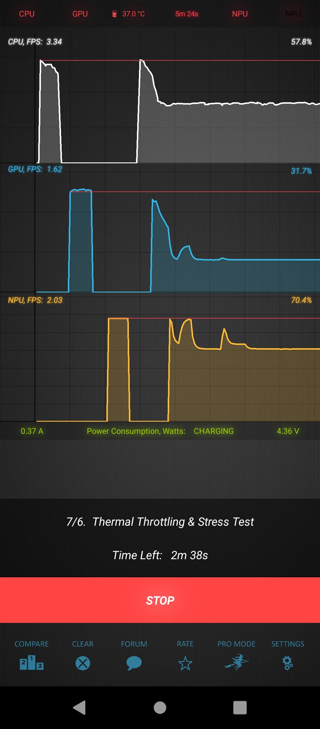 Тест на снижение производительности при нагреве мы проводим с помощью программы Burnout Benchmark, которая позволяет нагружать CPU, GPU и NPU: