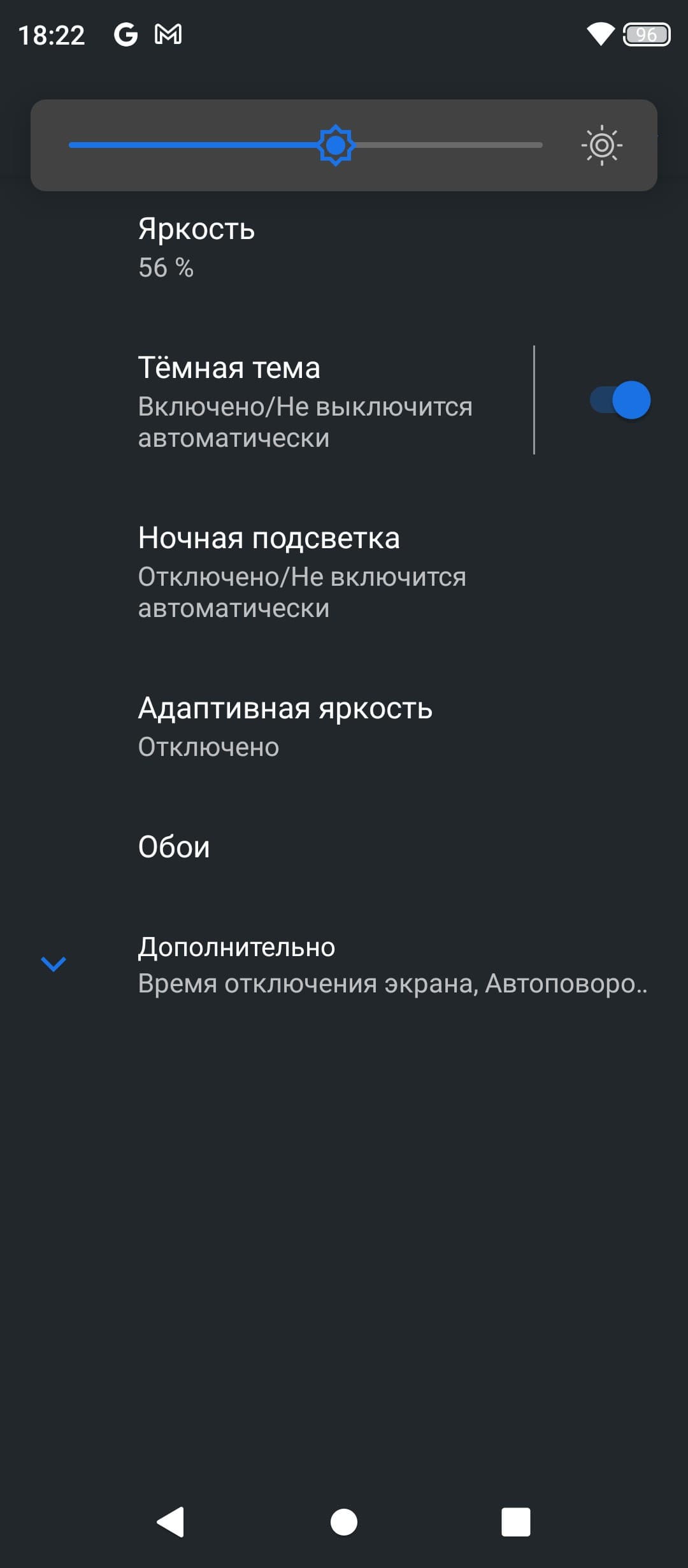 При ручном управлении яркостью и при выводе белого поля во весь экран максимальное значение яркости составило 550 кд/м². Максимальная яркость очень высокая, значит, учитывая отличные антибликовые свойства, смартфоном можно будет пользоваться даже в солнечный день вне помещения (хотя не все так хорошо, и об этом ниже). Минимальное значение яркости — 25 кд/м², поэтому в полной темноте яркость можно понизить до комфортного значения. В наличии автоматическая регулировка яркости по датчику освещенности (он находится на фронтальной панели близко к ее верхнему краю левее решетки фронтального громкоговорителя). В автоматическом режиме при изменении внешних условий освещенности яркость экрана как повышается, так и понижается. Работа этой функции зависит от положения ползунка регулировки яркости: им пользователь может попытаться выставить желаемый уровень яркости в текущих условиях. Если не вмешиваться, то в полной темноте функция автояркости уменьшает яркость до 25 кд/м² (сойдет), в условиях освещенного искусственным светом офиса (примерно 550 лк) устанавливает на 280 кд/м² (нормально), а условно под прямыми лучами солнца повышает до 550 кд/м² (до максимума). Результат по умолчанию нас удовлетворил, но для эксперимента мы попробовали повысить (понизить уже нельзя) яркость в полной темноте, и для трех указанных выше условий получили 48, 280 и 550 кд/м², что и требовалось. Получается, что функция автоподстройки яркости работает более-менее адекватно и позволяет пользователю настраивать свою работу под индивидуальные требования. На любом уровне яркости значимая модуляция подсветки отсутствует, поэтому нет и никакого мерцания экрана.