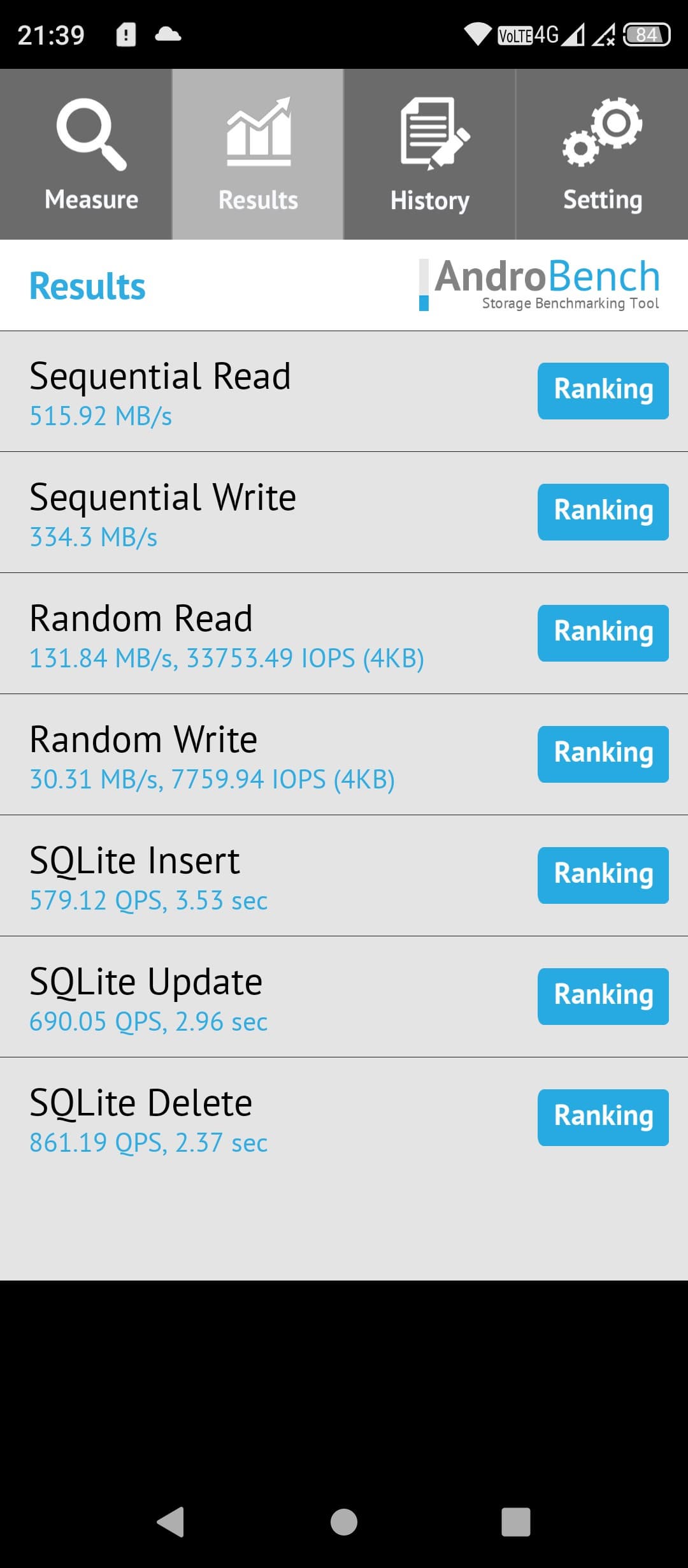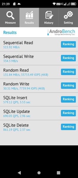 Результаты теста AndroBench на скорость работы с памятью:
