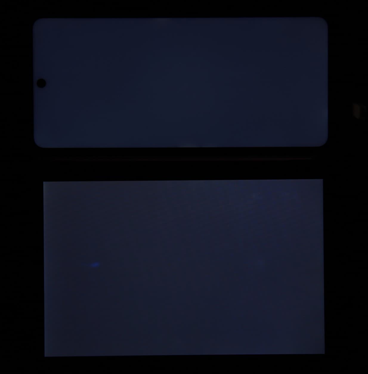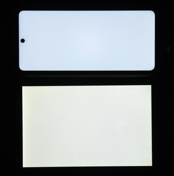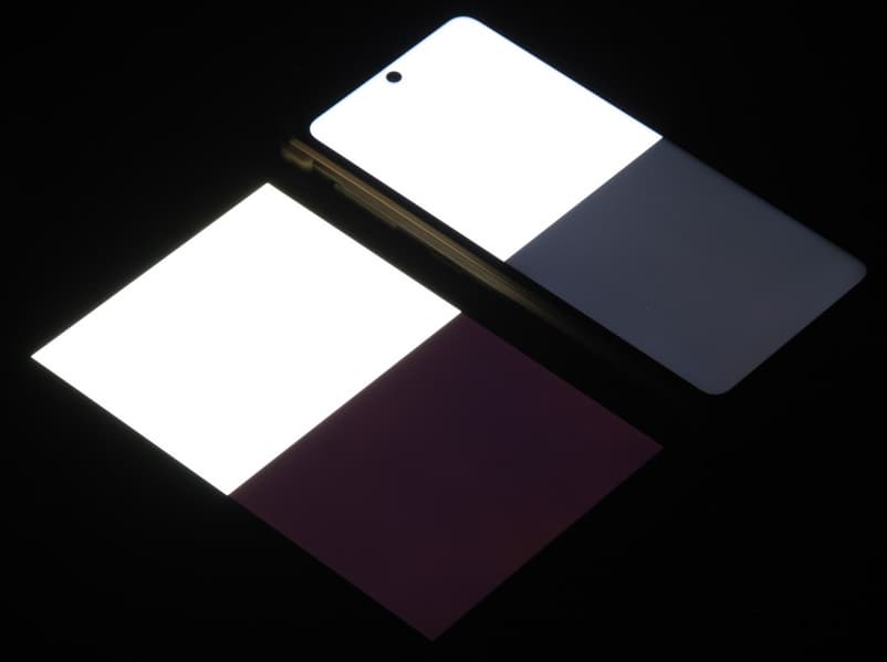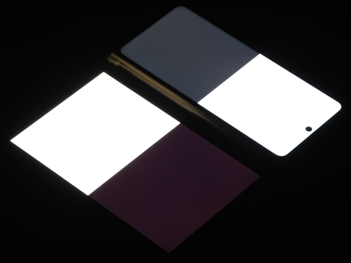 Яркость под углом у экранов уменьшилась (как минимум в 5 раз, исходя из разницы в выдержке), но в случае смартфона яркость снизилась сильнее. Черное поле при отклонении по диагонали высветляется сильно, но остается условно нейтрально-серым (так видно глазом). Фотографии ниже это демонстрируют (яркость белых участков в перпендикулярном плоскости экранов направлении одинаковая!):