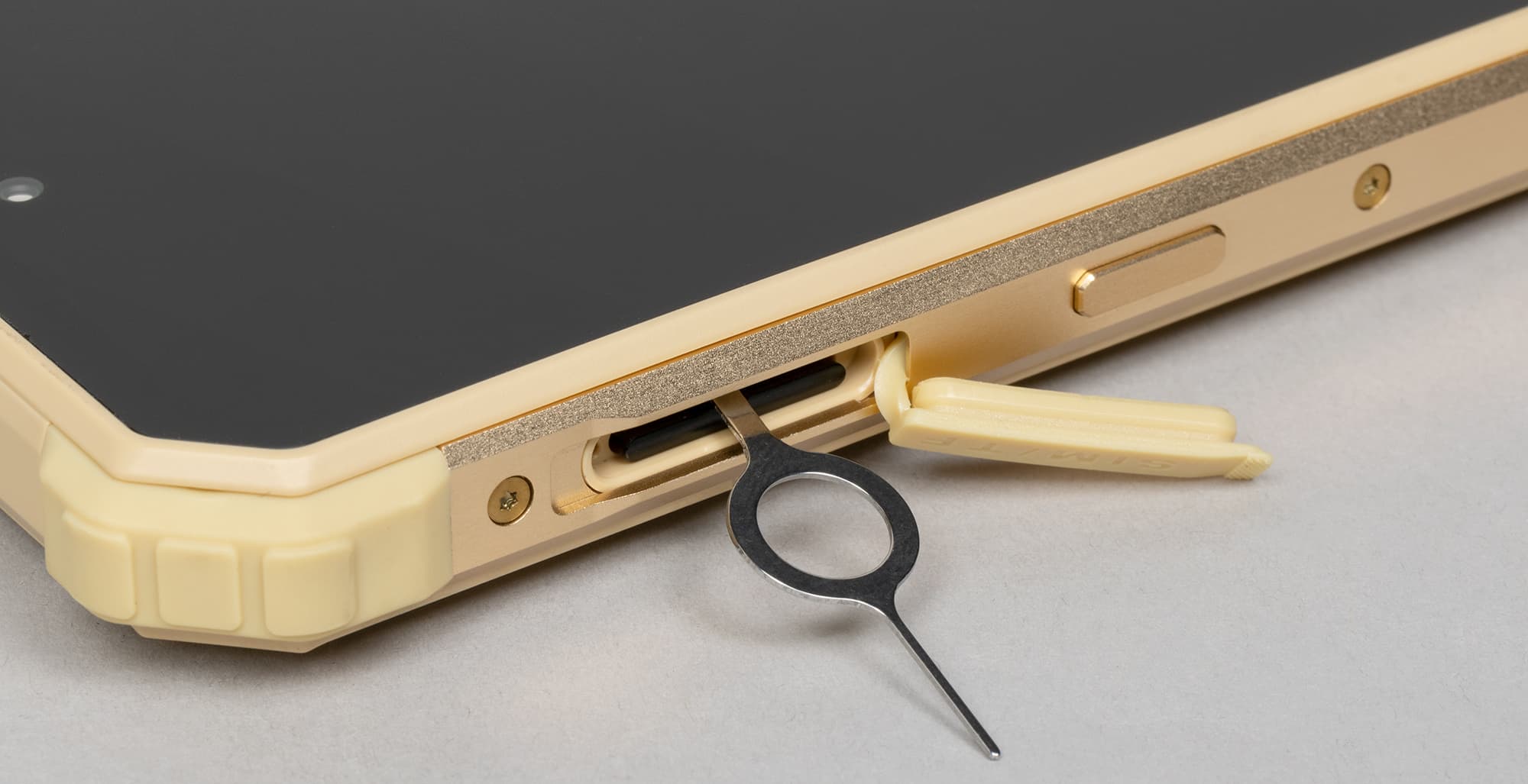 В тройной разъем на боку можно установить одновременно две карты Nano-SIM и карту памяти. Лоток вытягивается с усилием с помощью комплектного крючка: он глубже утоплен в телефон, чтобы сохранить высокий класс защиты.
