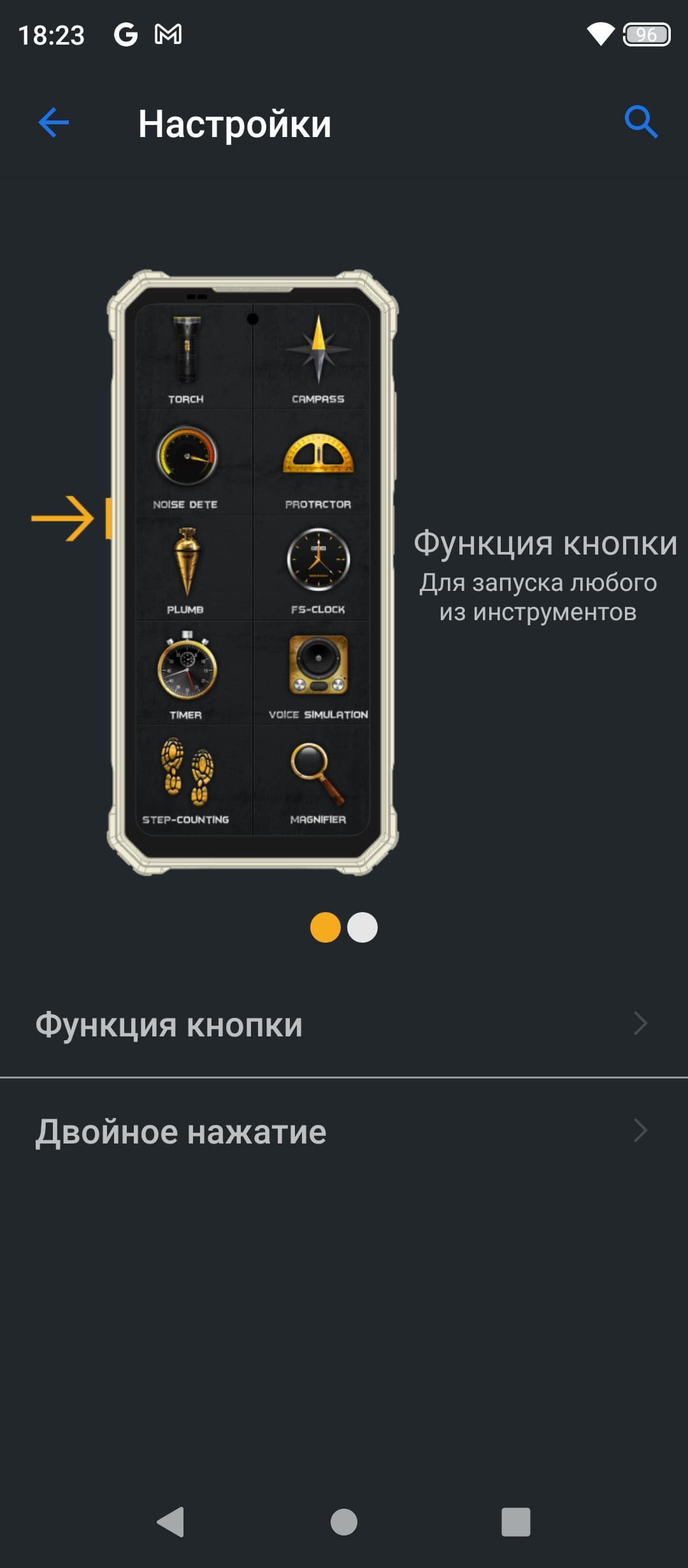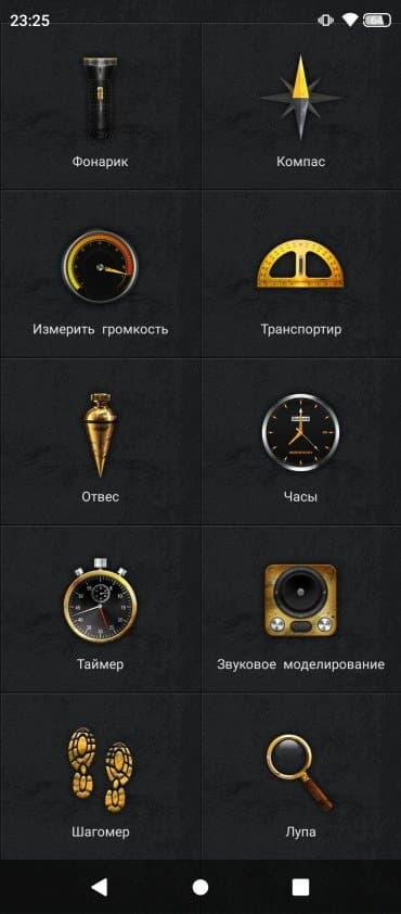 В качестве программной платформы используется ОС Android 11, практически чистая. Это лаконичный и удобный интерфейс, где все логично расставлено и оформлено. На месте официальный магазин приложений Google Play и сервисы Google. В качестве специфического дополнения для непредвиденных ситуаций в работе или в путешествиях есть вспомогательное приложение с набором специальных инструментов. Здесь есть и фонарик с компасом, и транспортир с отвесом, и даже сирена для отпугивания диких зверей и подачи сигнала SOS.