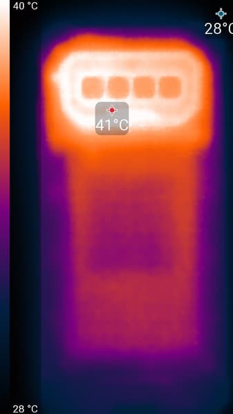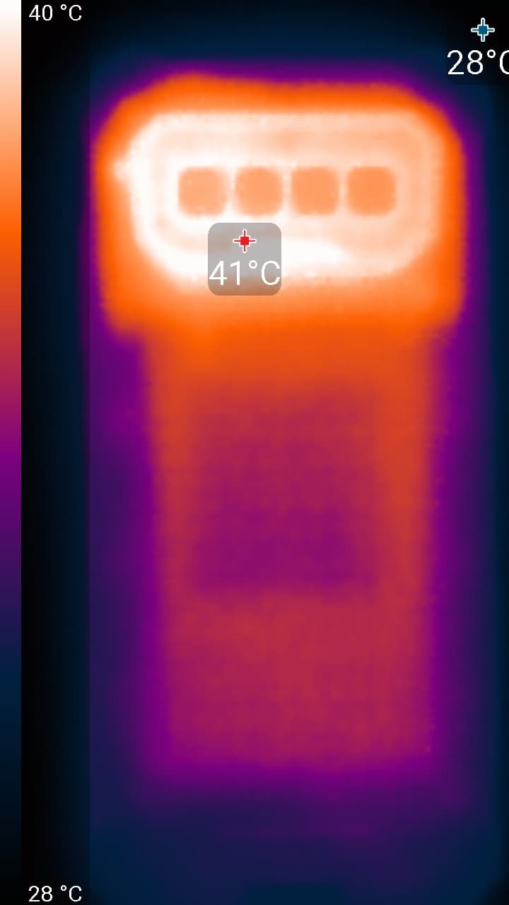 Нагрев больше в верхней части аппарата, что, видимо, соответствует расположению микросхемы SoC. По данным теплокамеры, максимальный нагрев составил 41 градусов (при температуре окружающего воздуха в 24 градуса), это невысокий нагрев в случае данного теста в сравнении с другими современными производительными смартфонами. Умеренный нагрев, возможно, обусловлен большими габаритами корпуса.