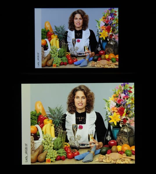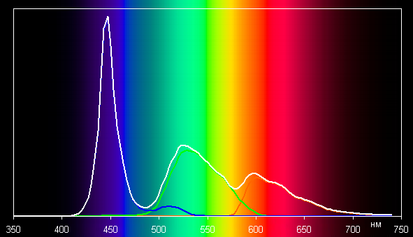 Спектры компонент достаточно хорошо разделены, что и обуславливает широкий цветовой охват. Для потребительского устройства широкий цветовой охват является недостатком, поскольку в итоге цвета изображений — рисунков, фотографий и фильмов, — ориентированных на пространство sRGB (а таких подавляющее большинство), имеют неестественную насыщенность. Особенно это заметно на узнаваемых оттенках, например на оттенках кожи. Результат приведен на фотографиях выше.
