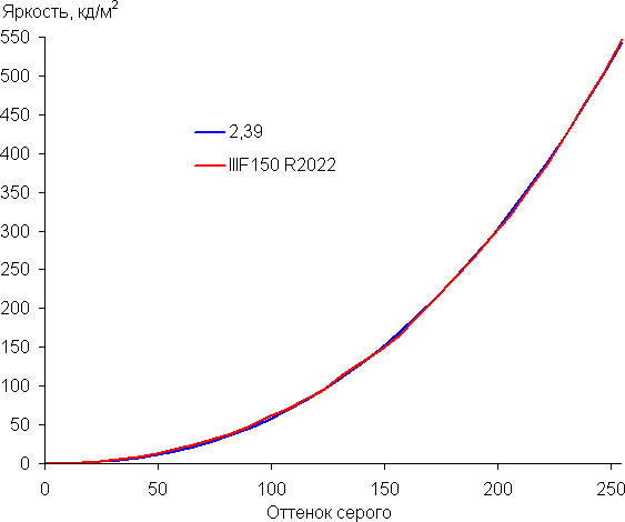 Построенная по 32 точкам с равным интервалом по численному значению оттенка серого гамма-кривая не выявила завала ни в светах, ни в тенях. Показатель аппроксимирующей степенной функции равен 2,39, что выше стандартного значения 2,2. При этом реальная гамма-кривая мало отклоняется от степенной зависимости: