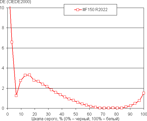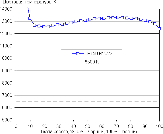 Баланс оттенков на шкале серого компромиссный, так как цветовая температура существенно выше стандартных 6500 К. Однако отклонение от спектра абсолютно черного тела (ΔE) на шкале серого ниже 10, что само по себе для потребительского устройства считается приемлемым показателем. При этом цветовая температура и ΔE мало изменяются от оттенка к оттенку — это положительно сказывается на визуальной оценке цветового баланса. (Самые темные области шкалы серого можно не учитывать, так как там баланс цветов не имеет большого значения, да и погрешность измерений цветовых характеристик на низкой яркости большая.)