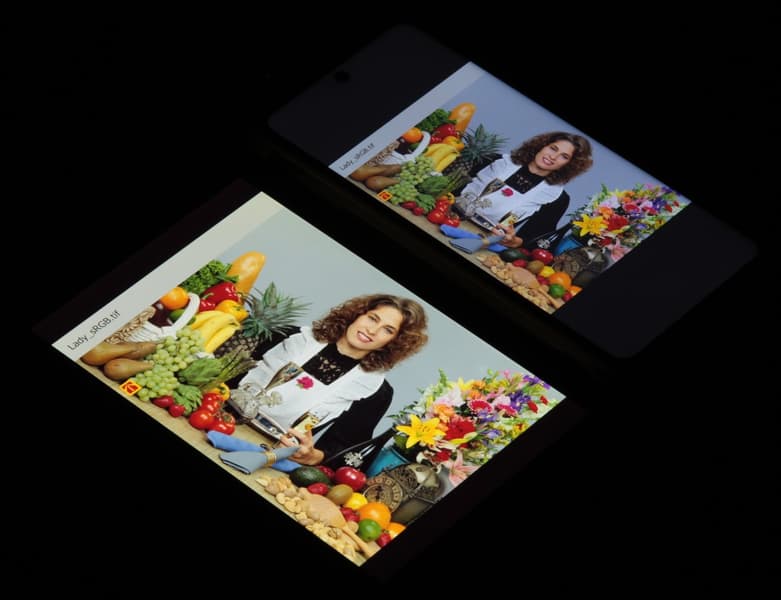 Цвета на экране смартфона явно перенасыщены, картинка затемнена, а цветовой баланс у экранов различается. Напомним, что фотография не может служить надежным источником сведений о качестве цветопередачи и приводится только для условной наглядной иллюстрации. Причина в том, что спектральная чувствительность матрицы фотоаппарата неточно совпадает с этой характеристикой человеческого зрения.