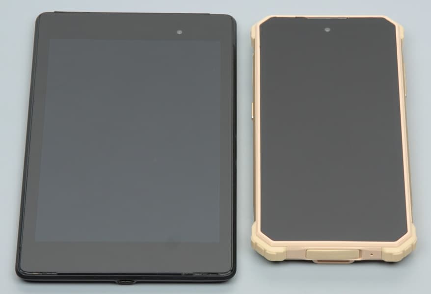 Лицевая поверхность экрана выполнена в виде стеклянной пластины с зеркально-гладкой поверхностью, устойчивой к появлению царапин. Судя по отражению объектов, антибликовые свойства экрана лучше, чем у экрана Google Nexus 7 (2013) (далее просто Nexus 7). Для наглядности приведем фотографию, на которой в выключенных экранах отражается белая поверхность (слева — Nexus 7, справа — IIIF150 R2022, далее их можно различать если не по размеру, то по геометрии экрана):