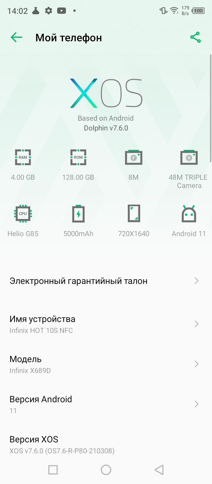 Infinix Hot 10s NFC работает на ОС Android 11-й версии с собственной фирменной оболочкой XOS 7.6. Оболочка «графически вдохновлена северным сиянием Исландии», как гласит описание. Это вполне типичный китайский интерфейс с массой разнообразных настроек, дополнительных функций и режимов. Например, можно скрывать от посторонних глаз часть информации на экране с помощью маски X-Proof. Есть игровой режим, его здесь называют Dir-link, также есть детский режим. Выдвижная виртуальная панель, управление жестами, разделение экрана, разделение аккаунтов соцсетей — всё присутствует. Магазин приложений Google Play и фирменные сервисы Google тоже на месте.