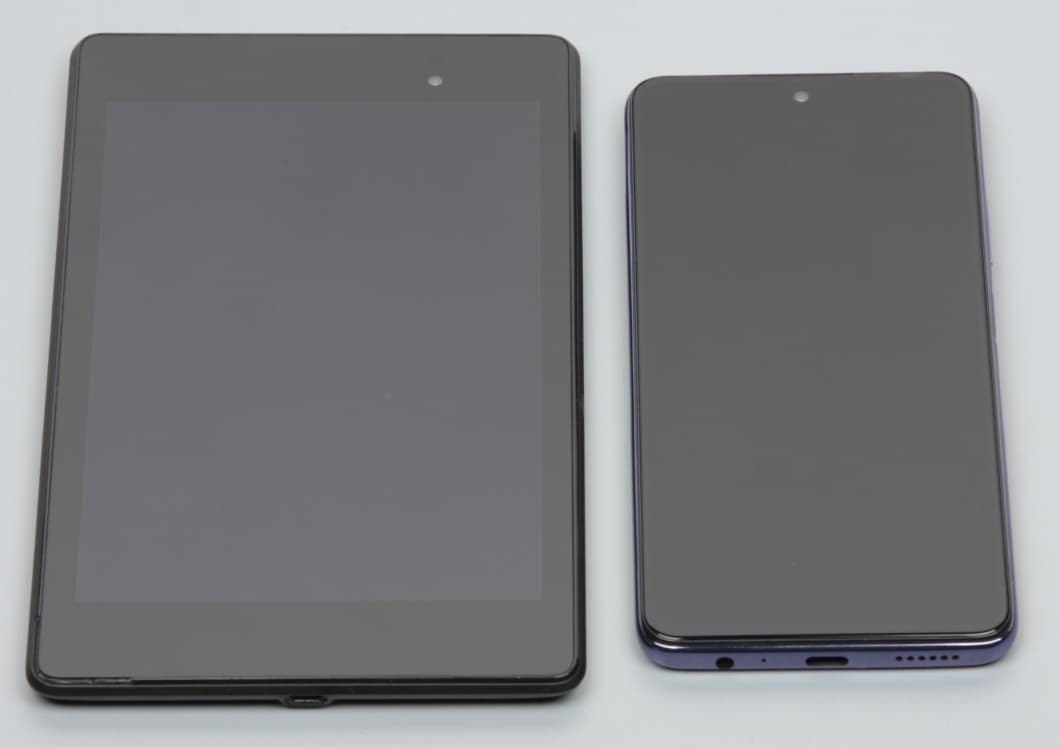 Лицевая поверхность экрана выполнена в виде стеклянной пластины с зеркально-гладкой поверхностью, устойчивой к появлению царапин. Судя по отражению объектов, антибликовые свойства экрана лучше, чем у экрана Google Nexus 7 (2013) (далее просто Nexus 7). Для наглядности приведем фотографию, на которой в выключенных экранах отражается белая поверхность (слева — Nexus 7, справа — Infinix Note 10 Pro, далее их можно различать по размеру):