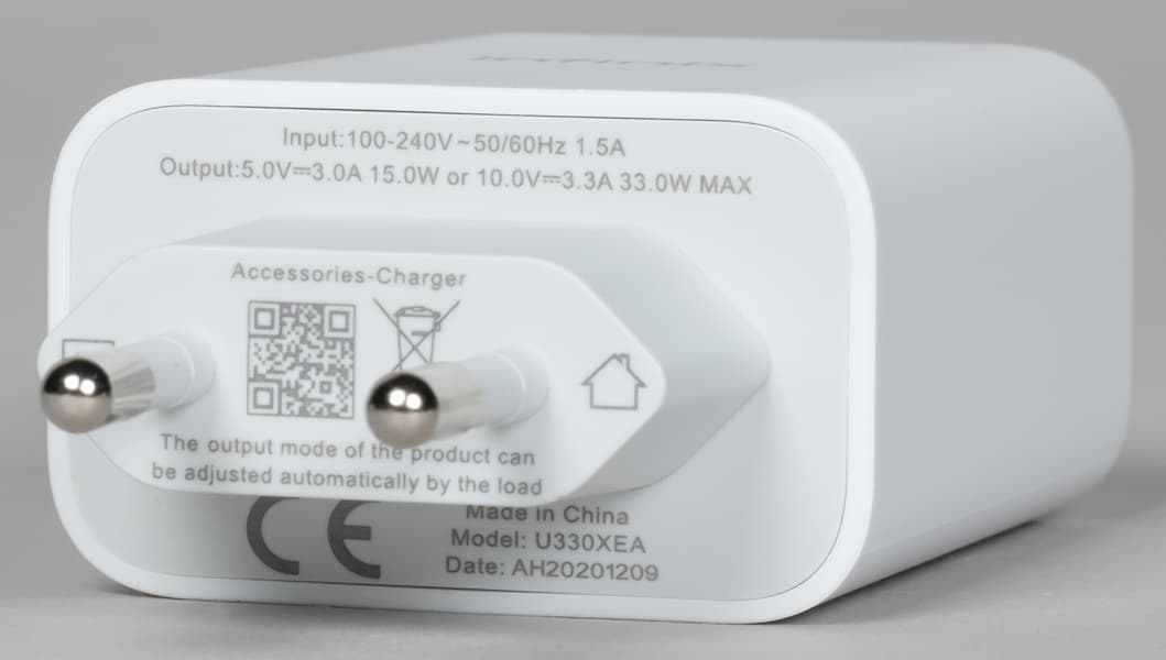 Смартфон получил комплектный сетевой адаптер на 33 Вт, полная зарядка от него осуществляется приблизительно за 1 час 45 минут. Беспроводная зарядка не поддерживается.