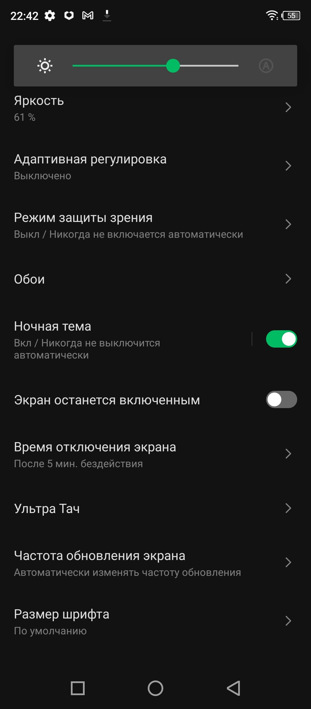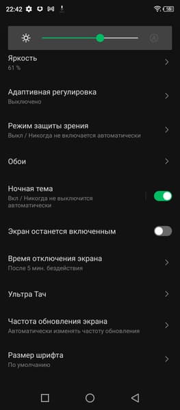 При ручном управлении яркостью и при выводе белого поля во весь экран максимальное значение яркости составило 430 кд/м². Максимальная яркость не очень высокая, но, учитывая отличные антибликовые свойства, что-то можно будет рассмотреть на экране даже в солнечный день вне помещения. Минимальное значение яркости — 3 кд/м², поэтому в полной темноте яркость можно понизить до комфортного значения. В наличии автоматическая регулировка яркости по датчику освещенности (он находится на фронтальной панели близко к ее верхнему краю правее решетки фронтального громкоговорителя). В автоматическом режиме при изменении внешних условий освещенности яркость экрана как повышается, так и понижается. Работа этой функции зависит от положения ползунка регулировки яркости: им пользователь может попытаться выставить желаемый уровень яркости в текущих условиях. Если не вмешиваться, то в полной темноте функция автояркости уменьшает яркость до 10 кд/м² (сойдет), в условиях освещенного искусственным светом офиса (примерно 550 лк) устанавливает на 175 кд/м² (нормально), а условно под прямыми лучами солнца повышает до 430 кд/м² (до максимума). Результат по умолчанию нас удовлетворил, но для эксперимента мы попробовали понизить яркость в полной темноте — подвинули ползунок чуть влево. Яркость стала ниже, но после цикла повышения внешней освещенности и ее снижения, все вернулось к тем же значениям, что были до вмешательства. Получается, что функция автоподстройки яркости хоть и работает адекватно, но не позволяет пользователю настраивать свою работу под индивидуальные требования. На любом уровне яркости значимая модуляция подсветки отсутствует, поэтому нет и никакого мерцания экрана.