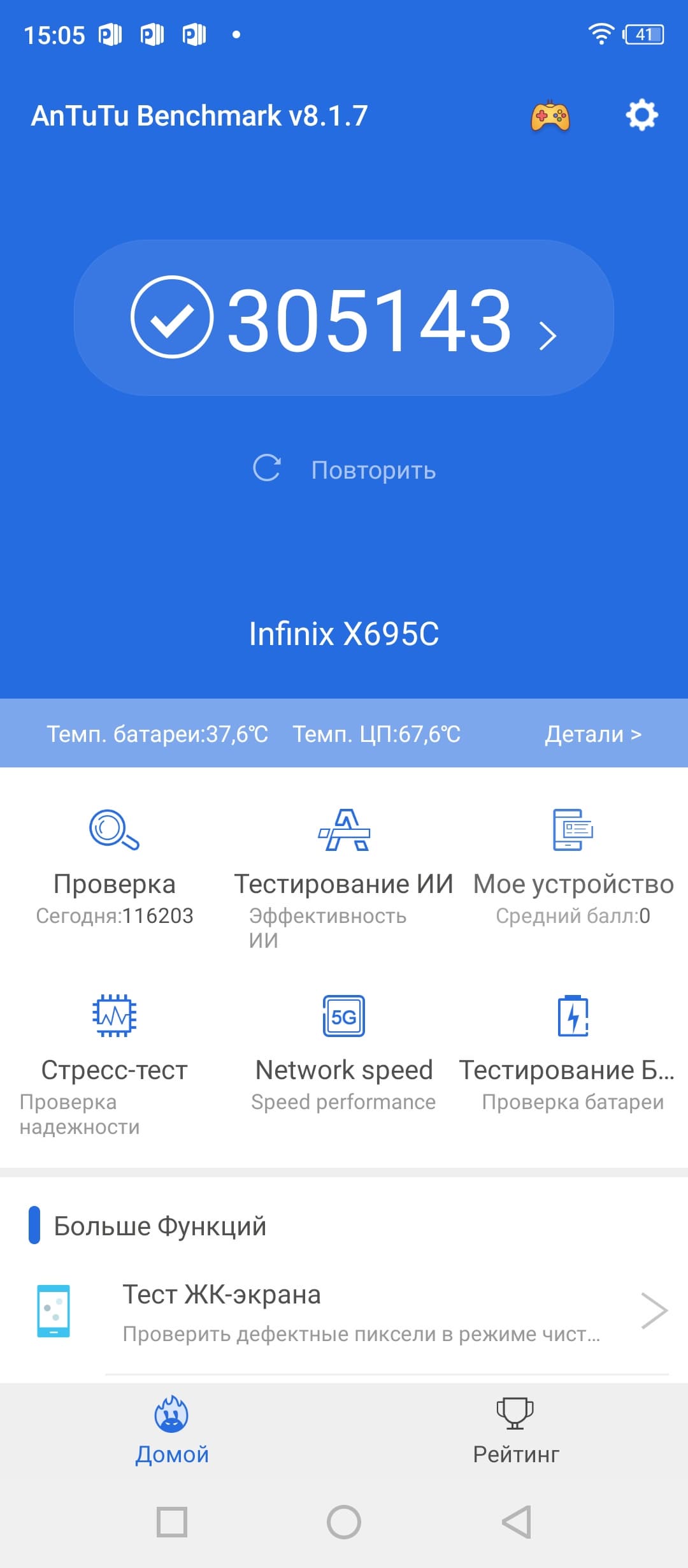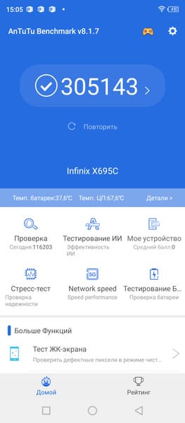 | AnTuTu (v8.x) (больше — лучше) | 305143 | 267863 | 277886 | 183867 | 225064 |