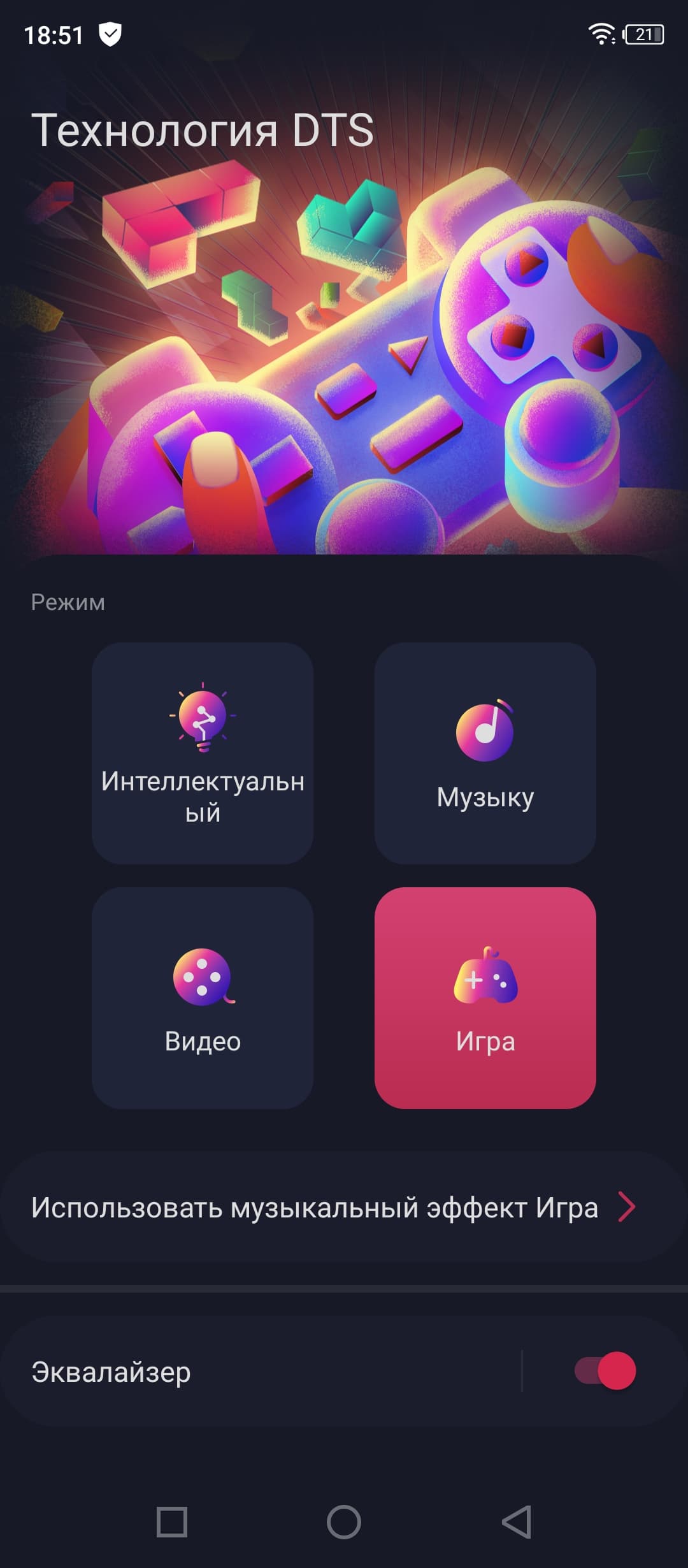 Стереодинамики смартфона выдают громкий и даже вполне чистый звук. Играть на большом экране с такой мощью «под капотом», да еще и с хорошим стереозвуком — одно удовольствие. В наушниках звучание тоже приемлемое, есть поддержка DTS с пресетами и пятиполосный эквалайзер для ручной регулировки. Не забыт и 3,5-миллиметровый аудиовыход для проводных наушников.