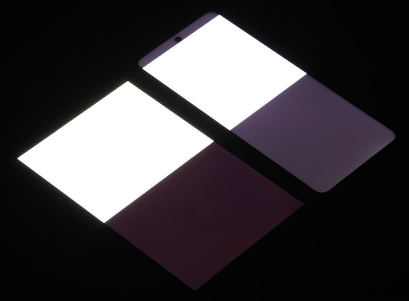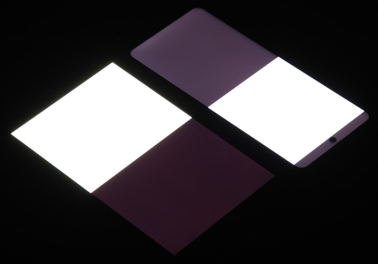 Яркость под углом у экранов уменьшилась (как минимум в 5 раз, исходя из разницы в выдержке), но в случае Infinix Note 10 Pro яркость снизилась сильнее. Черное поле при отклонении по диагонали сильно высветляется, и приобретает слегка красноватый оттенок. Фотографии ниже это демонстрируют (яркость белых участков в перпендикулярном плоскости экранов направлении одинаковая!):