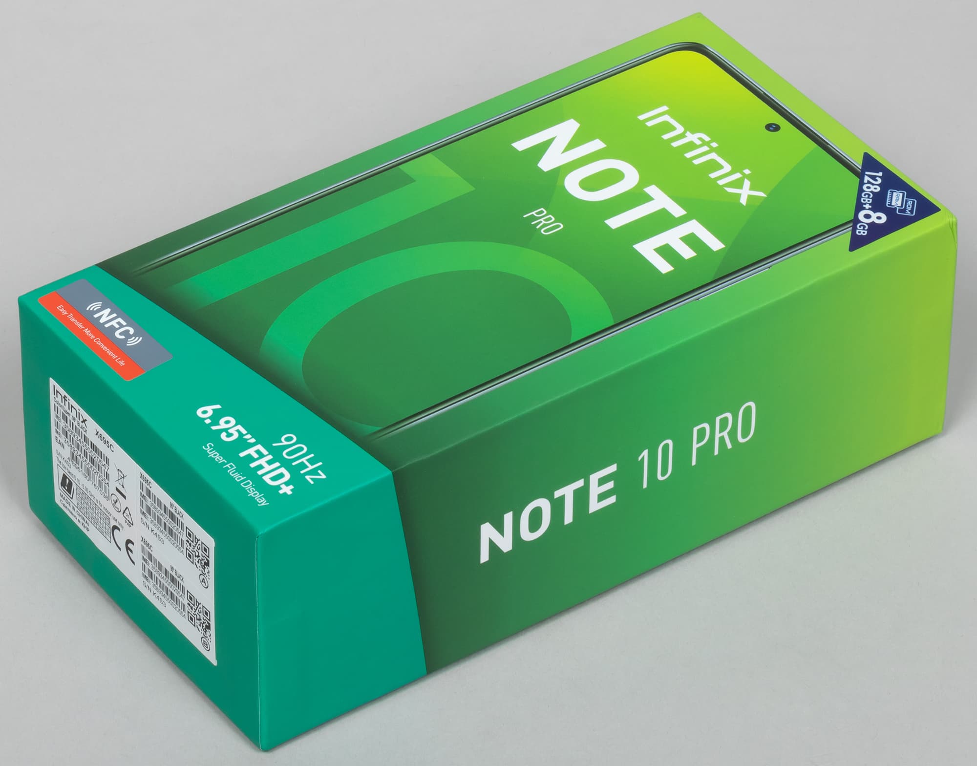 Infinix Note 10 Pro поставляется в ярко оформленной твердой картонной коробке в фирменных темно-зеленых оттенках.