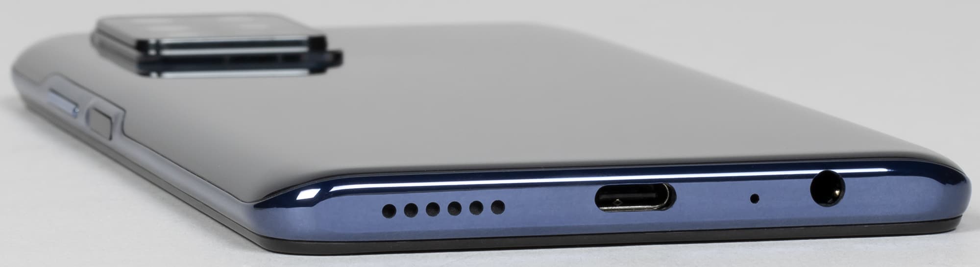 На торце сверху ничего нет, снизу же установлены 3,5-миллиметровый аудиовыход для наушников, разъем USB Type-C, а также динамик и разговорный микрофон.