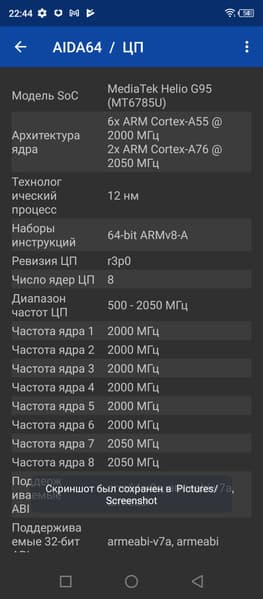 - SoC Mediatek Helio G95, 8 процессорных ядер (2×Cortex-A76 @2,05 ГГц + 6×Cortex-A55 @2,0 ГГц)