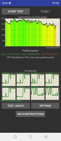 Тестирование традиционно проводилось на обычном уровне энергопотребления без использования функций энергосбережения, хотя таковые в аппарате имеются. Условия тестирования: выставлен минимальный комфортный уровень яркости (примерно 100 кд/м²). Тесты: беспрерывное чтение в программе Moon+ Reader (со стандартной, светлой темой); беспрерывный просмотр видео в HD-качестве (720р) через домашнюю сеть Wi-Fi; игра Injustice 2 с автонастройками графики.