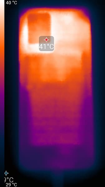 Нагрев выше в верхней части аппарата, что, видимо, соответствует расположению микросхемы SoC. По данным теплокамеры, максимальный нагрев составил 41 градус (при температуре окружающего воздуха в 24 градуса), это средний нагрев в данном тесте для современных смартфонов.