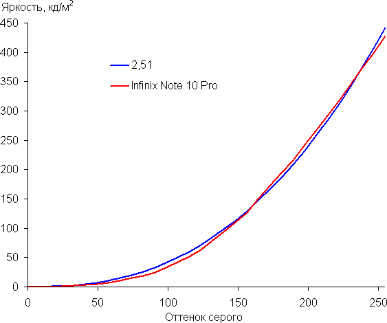 Контрастность (примерно в центре экрана) высокая — порядка 1200:1. Время отклика при переходе черный-белый-черный равно 17 мс (8,5 мс вкл. + 8,5 мс выкл.). Переход между полутонами серого 25% и 75% (по численному значению цвета) и обратно в сумме занимает 26 мс. В настройках экран можно включить режим с повышенной до 90 Гц частотой обновления, что приводит как минимум к увеличению плавности прокрутки списков в меню. Построенная по 32 точкам с равным интервалом по численному значению оттенка серого гамма-кривая не выявила завала ни в светах, ни в тенях. Показатель аппроксимирующей степенной функции равен 2,51, что выше стандартного значения 2,2, потому и изображение затемненно. При этом реальная гамма-кривая немного отклоняется от степенной зависимости: