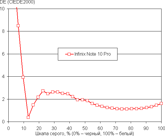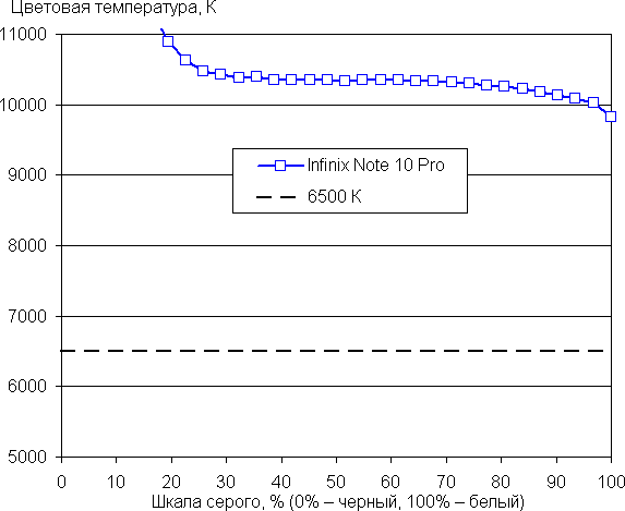 Баланс оттенков на шкале серого компромиссный, так как цветовая температура существенно выше стандартных 6500 К. Однако отклонение от спектра абсолютно черного тела (ΔE) на шкале серого ниже 3, что для потребительского устройства считается отличным показателем. При этом цветовая температура и ΔE мало изменяются от оттенка к оттенку — это положительно сказывается на визуальной оценке цветового баланса. (Самые темные области шкалы серого можно не учитывать, так как там баланс цветов не имеет большого значения, да и погрешность измерений цветовых характеристик на низкой яркости большая.)