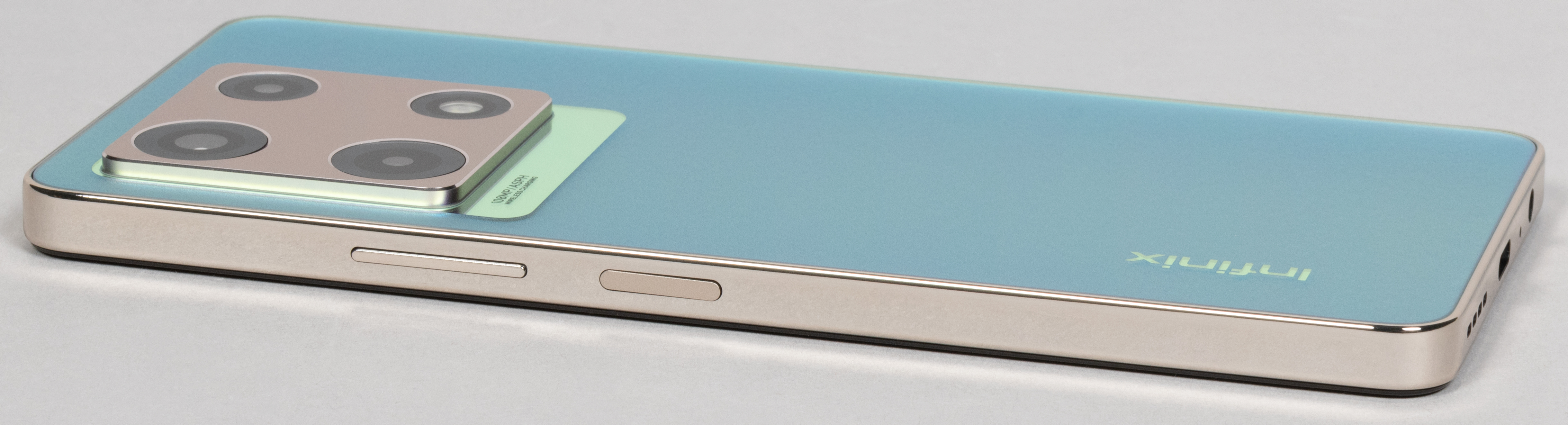 Смартфон Infinix Note 30 Pro выпускается в черном и золотистом вариантах, причем меняется цвет не только спинки, но и боковой рамки. Полноценной защиты от влаги и пыли у корпуса смартфона нет, но упомянута легкая защита от брызг по стандарту IP53.