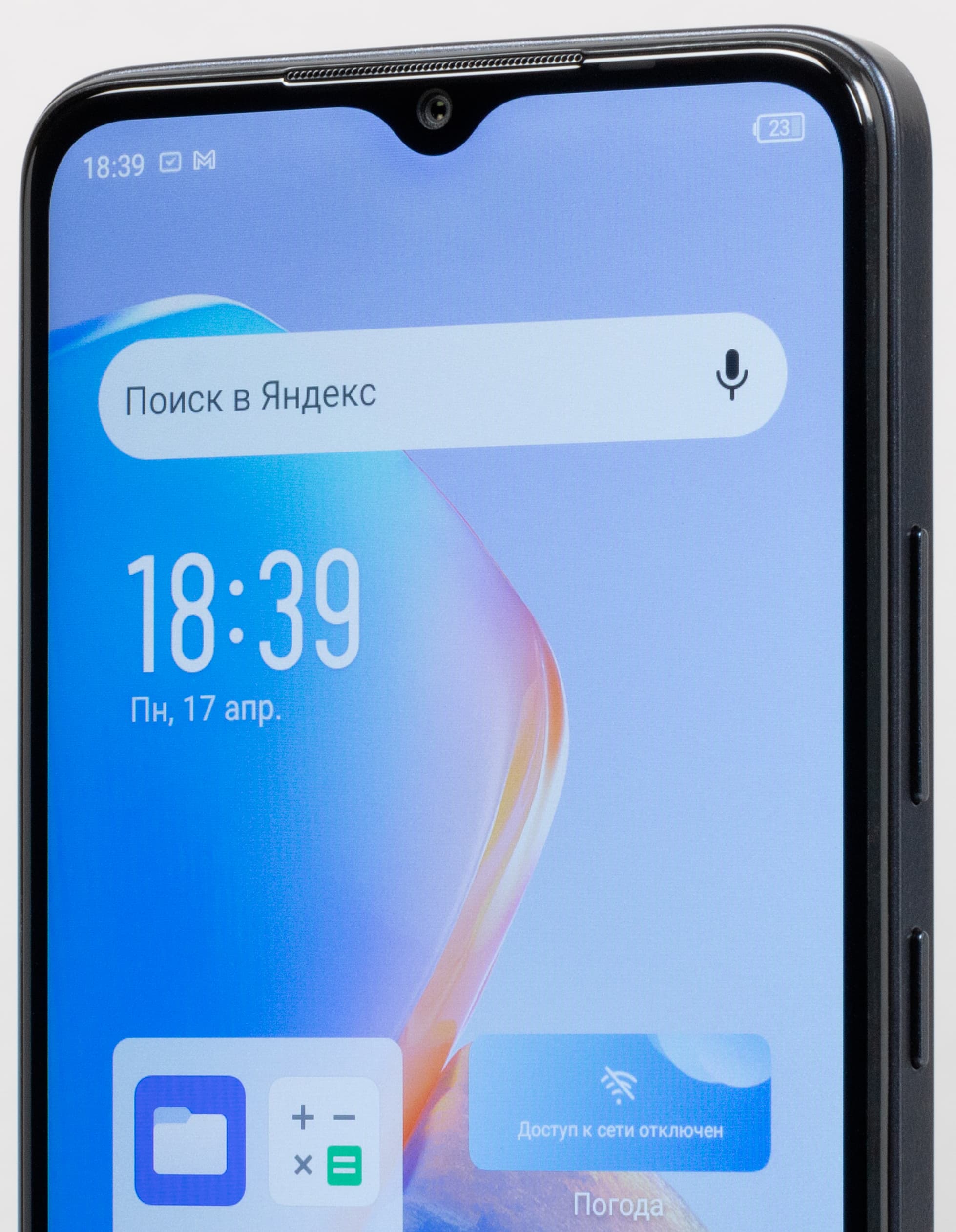 Корпус новинки выполнен в ставшем теперь популярным дизайне без зауженных боковин и загнутых панелей, который копирует современный iPhone. Дизайн простой и по всем параметрам выгодный. Он и эргономичный, и на вид эффектный. Такой корпус без скользких обводов и зауженных граней максимально надежно удерживается в ладони, не прокручивается и не проскальзывает. А современный дизайн привлекает внимание к совсем дешевому смартфону начального уровня, который, благодаря дизайну, выглядит дороже, чем на самом деле.
