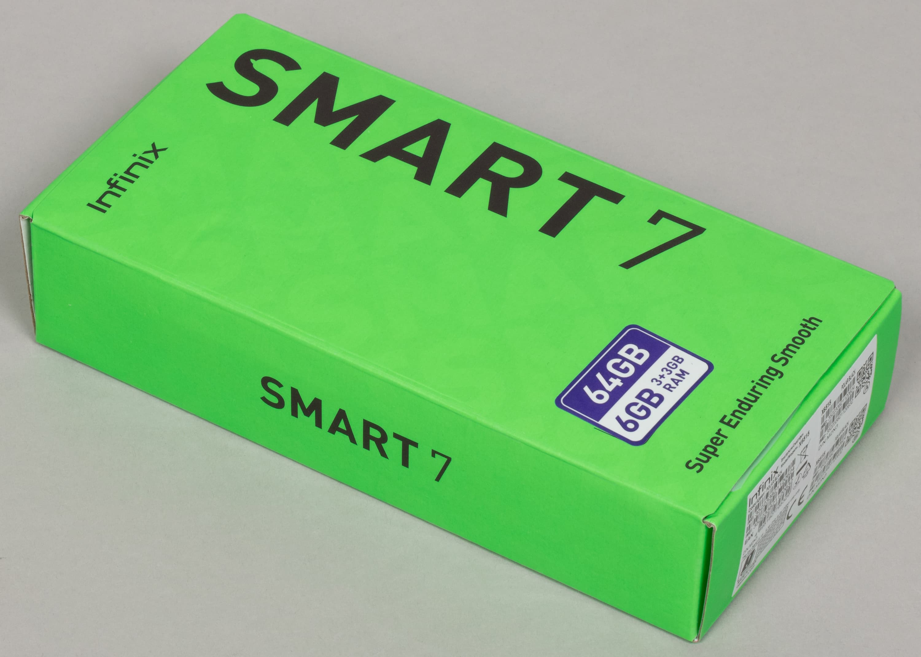 Infinix Smart 7 поставляется в твердой картонной упаковке с привычным оформлением в фирменном зеленом цвете.