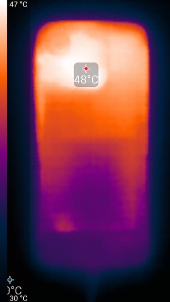 Нагрев больше в верхней правой части аппарата, что, видимо, соответствует расположению микросхемы SoC. По данным теплокамеры, максимальный нагрев составил 48 градусов (при температуре окружающего воздуха в 24 градуса), это средний нагрев в случае данного теста в сравнении с другими современными смартфонами.