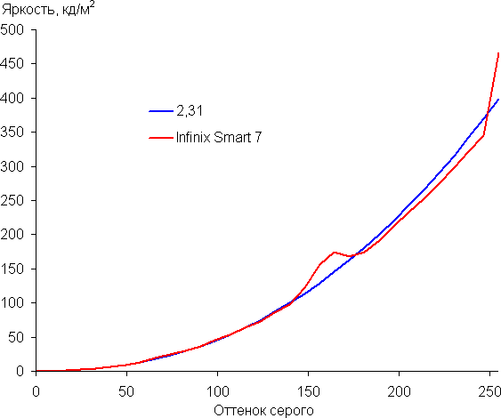 Построенная по 32 точкам с равным интервалом по численному значению оттенка серого гамма-кривая не выявила завала ни в светах, ни в тенях. Показатель аппроксимирующей степенной функции равен 2,31, что выше стандартного значения 2,2. При этом реальная гамма-кривая существенно отклоняется от степенной зависимости: