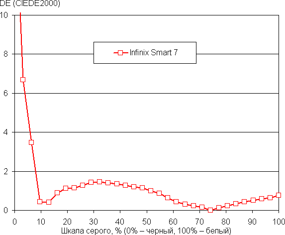 (Самые темные области шкалы серого можно не учитывать, так как там баланс цветов не имеет большого значения, да и погрешность измерений цветовых характеристик на низкой яркости большая.)