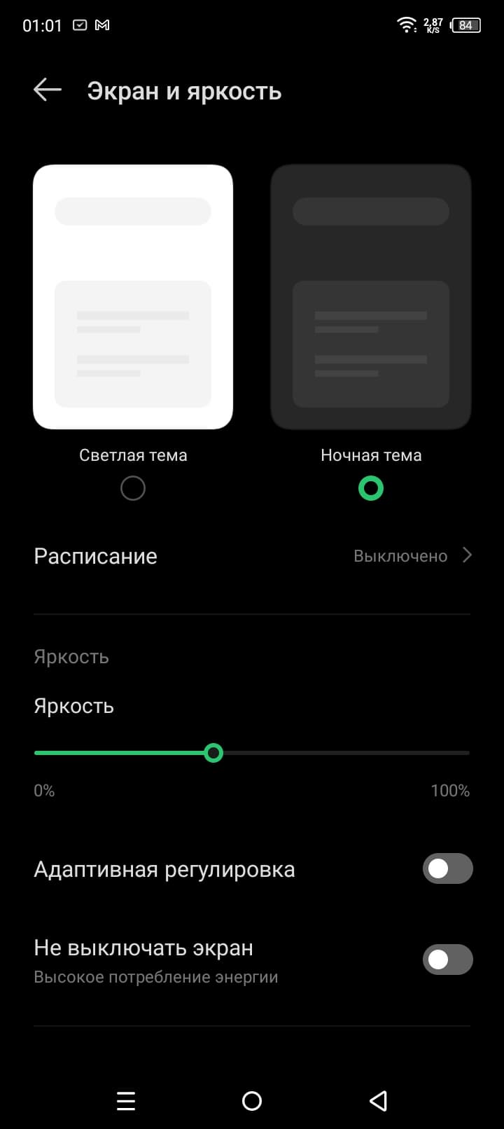 При ручном управлении яркостью и при выводе белого поля во весь экран максимальное значение яркости составило 480 кд/м². Максимальная яркость высокая (хотя есть момент, о котором ниже), и, учитывая отличные антибликовые свойства, смартфоном как-то можно будет пользоваться даже в солнечный день вне помещения. Минимальное значение яркости — 10 кд/м², поэтому в полной темноте яркость можно понизить до комфортного значения. В наличии автоматическая регулировка яркости по датчику освещенности (он находится на фронтальной панели близко к ее верхнему краю правее решетки фронтального громкоговорителя). В автоматическом режиме при изменении внешних условий освещенности яркость экрана как повышается, так и понижается. Работа этой функции зависит от положения ползунка регулировки яркости: им пользователь может попытаться выставить желаемый уровень яркости в текущих условиях. Если не вмешиваться, то в полной темноте функция автояркости уменьшает яркость до 14 кд/м² (сойдет), в условиях освещенного искусственным светом офиса (примерно 550 лк) устанавливает на 200 кд/м² (нормально), а условно под прямыми лучами солнца повышает до 480 кд/м² (до максимума). Результат по умолчанию нас удовлетворил, но для эксперимента мы попробовали понизить яркость в полной темноте — подвинули ползунок чуть влево. Яркость стала ниже, но после цикла повышения внешней освещенности и ее снижения, все вернулось к тем же значениям, что были до вмешательства. Получается, что функция автоподстройки яркости хоть и работает адекватно, но не позволяет пользователю настраивать свою работу под индивидуальные требования. На любом уровне яркости значимая модуляция подсветки отсутствует, поэтому нет и никакого мерцания экрана.