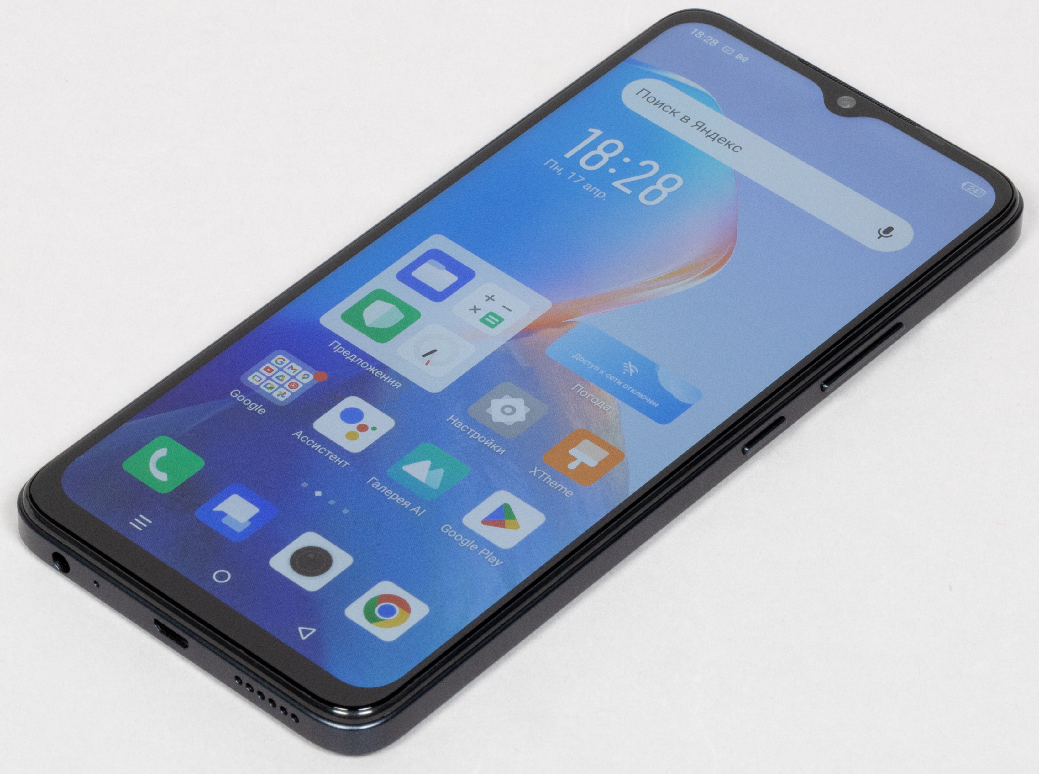 На верхнем торце ничего нет. На нижнем размещены динамик, микрофон, разъем Micro-USB и 3,5-миллиметровый аудиовыход для наушников. Про отсталый медленный и несимметричный разъем Micro-USB, который разработчики вроде бы уже более 10 лет назад договаривались искоренить, даже говорить больше не будем — оставим это на совести производителя. Все слова давно сказаны, а воз и ныне там.