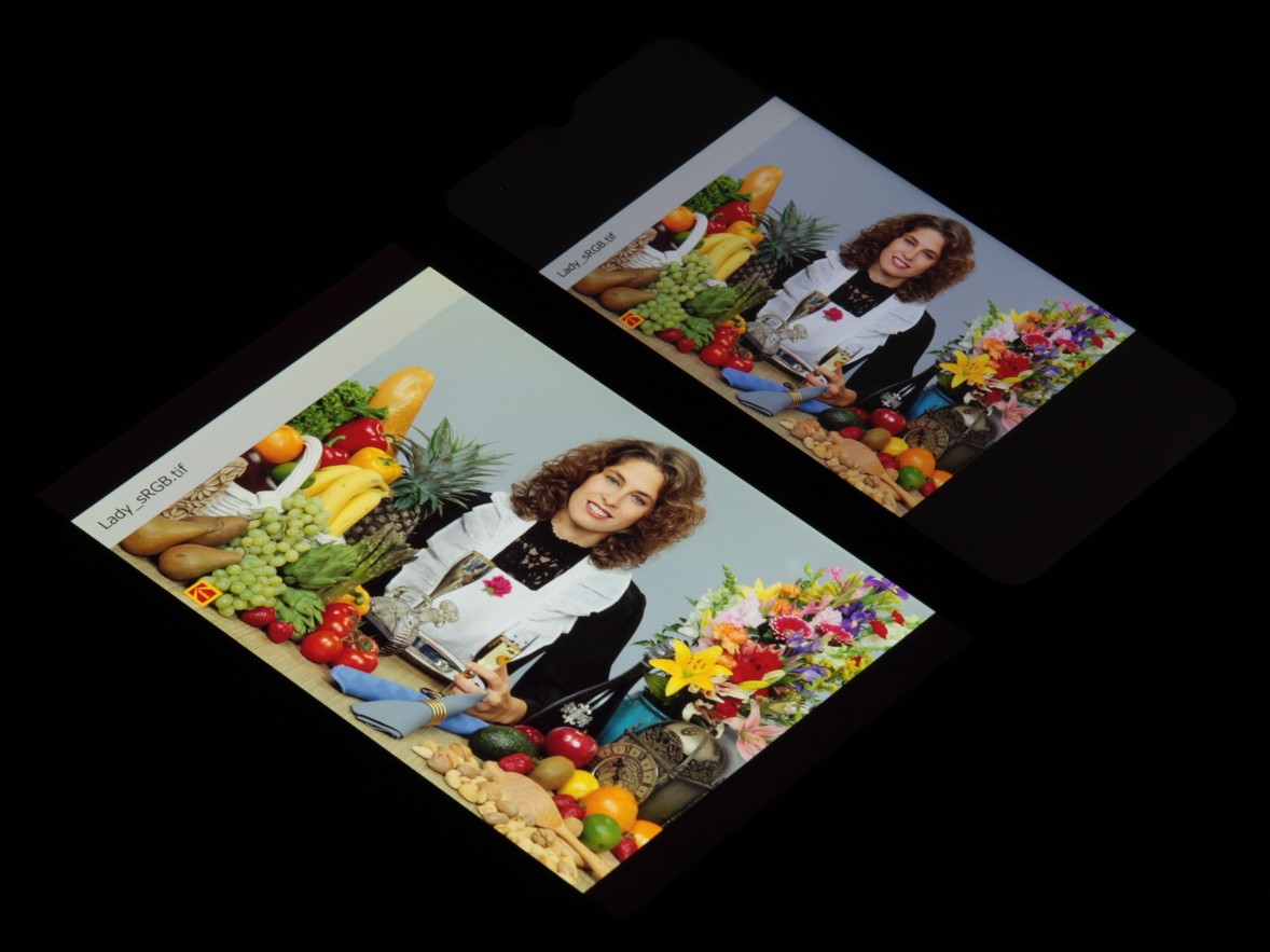 Экран имеет хорошие углы обзора без значительного сдвига цветов даже при больших отклонениях взгляда от перпендикуляра к экрану и без инвертирования оттенков. Для сравнения приведем фотографии, на которых на экраны Infinix Smart 7 и Nexus 7 выведены одинаковые изображения, при этом яркость экранов изначально установлена примерно на 200 кд/м², а цветовой баланс на фотоаппарате принудительно переключен на 6500 К.