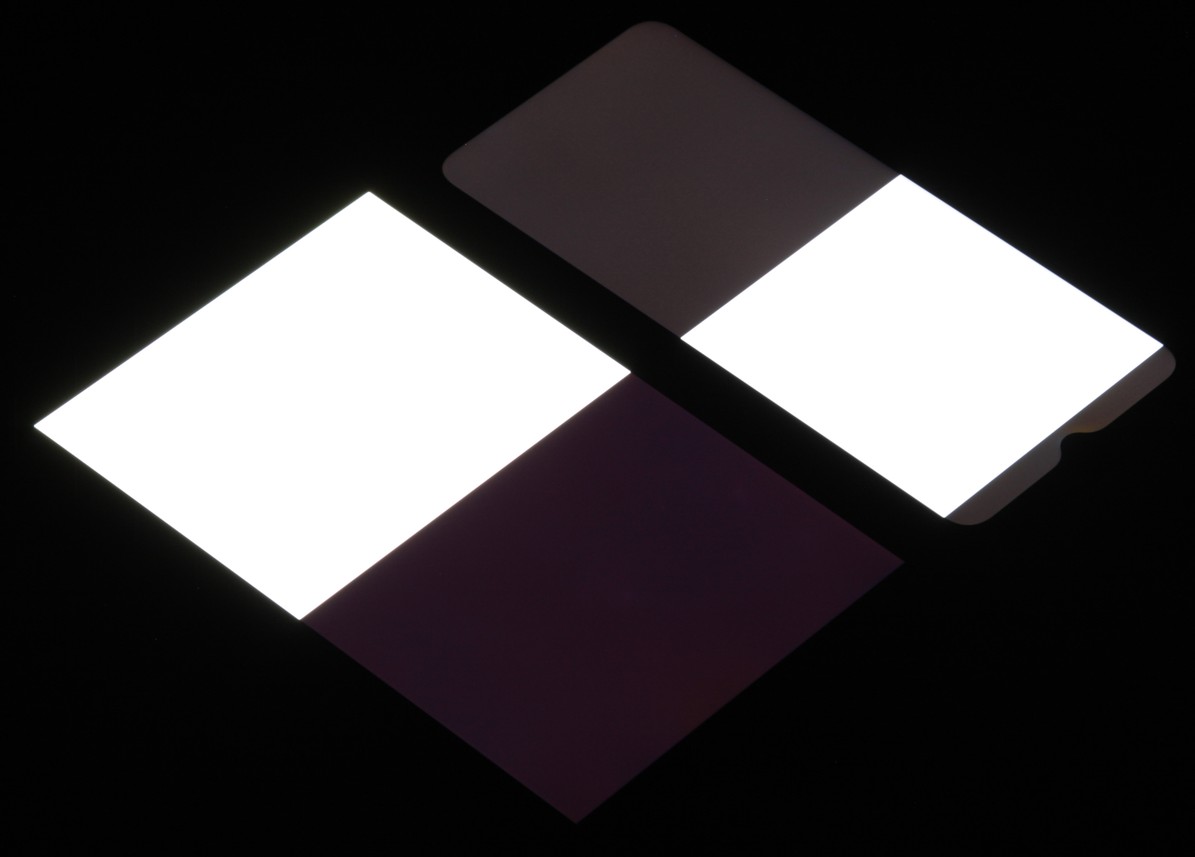 Яркость под углом у экранов уменьшилась (как минимум в 5 раз, исходя из разницы в выдержке), но в случае Infinix Smart 7 яркость снизилась заметно сильнее. Черное поле при отклонении по диагонали заметно высветляется и приобретает красноватый оттенок. Впрочем, именно по значению яркости высветление невысокое, так как оно маскируется сильным снижением яркости экрана под углами. Если ориентироваться на яркость белого под углами, то относительно ее высветление черного сильное. Фотографии ниже это демонстрируют (яркость белых участков в перпендикулярном плоскости экранов направлении одинаковая!):