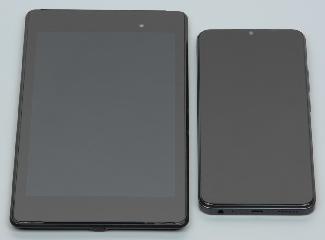 Лицевая поверхность экрана выполнена в виде стеклянной пластины с зеркально-гладкой поверхностью, устойчивой к появлению царапин. Судя по отражению объектов, антибликовые свойства экрана лучше, чем у экрана Google Nexus 7 (2013) (далее просто Nexus 7). Для наглядности приведем фотографию, на которой в выключенных экранах отражается белая поверхность (слева — Nexus 7, справа — Infinix Smart 7, далее их можно различать по размеру):