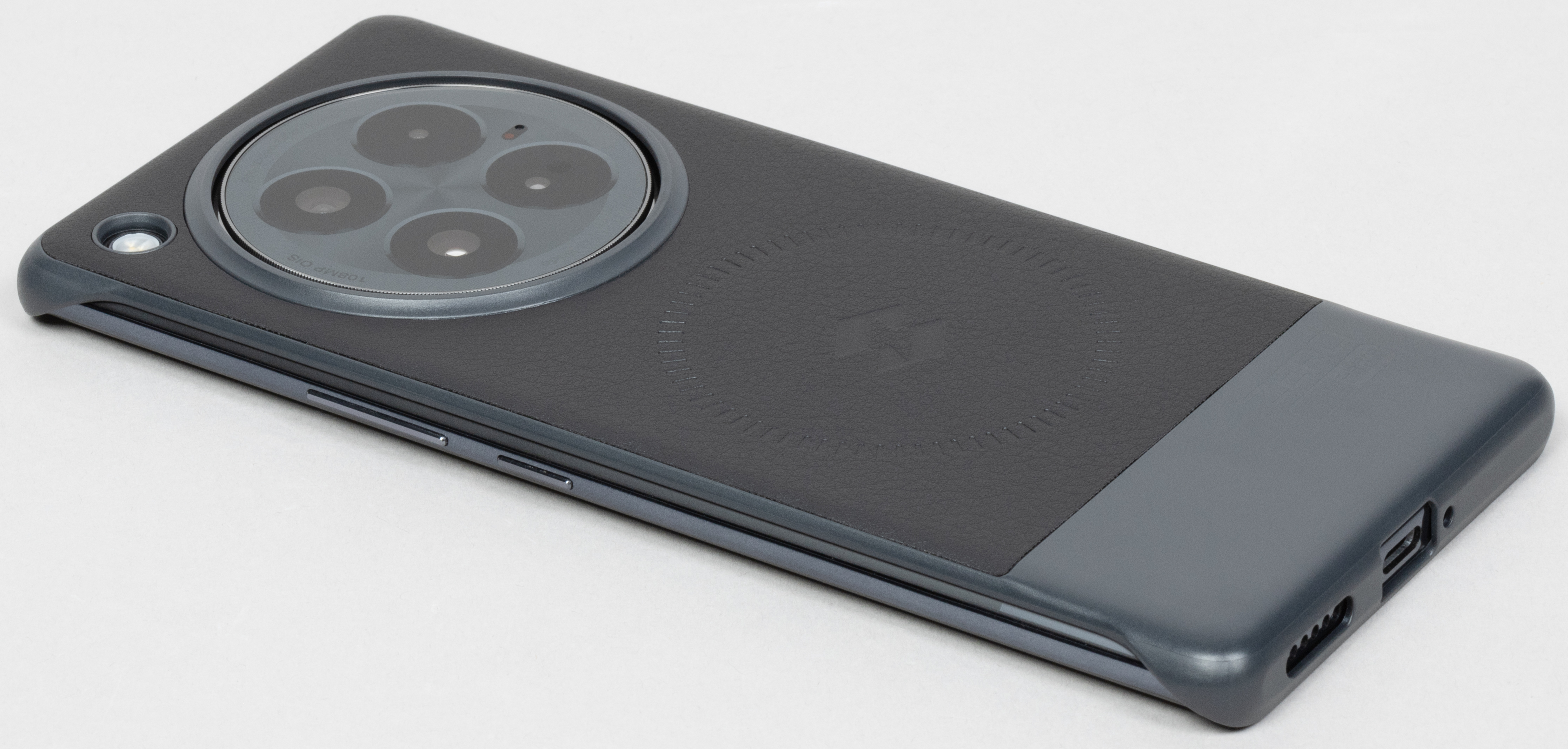 Комплектный защитный чехол явно выше уровнем, чем типичный прозрачный силиконовый: это твердая пластиковая накладка, часть спинки покрыта экокожей, а боковины полностью открыты. Есть специальные отметины в форме круга: чехол совместим с беспроводной зарядкой по протоколу Qi.