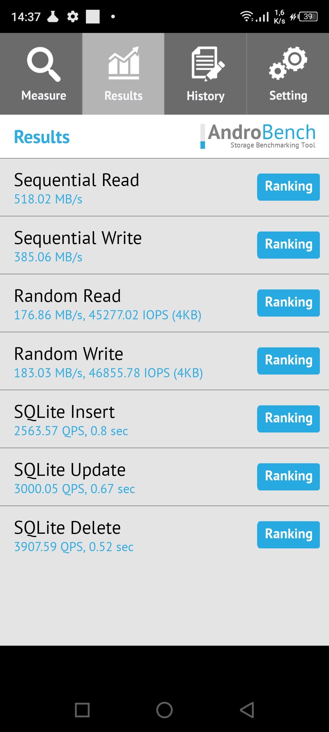 Результаты теста AndroBench на скорость работы с памятью: