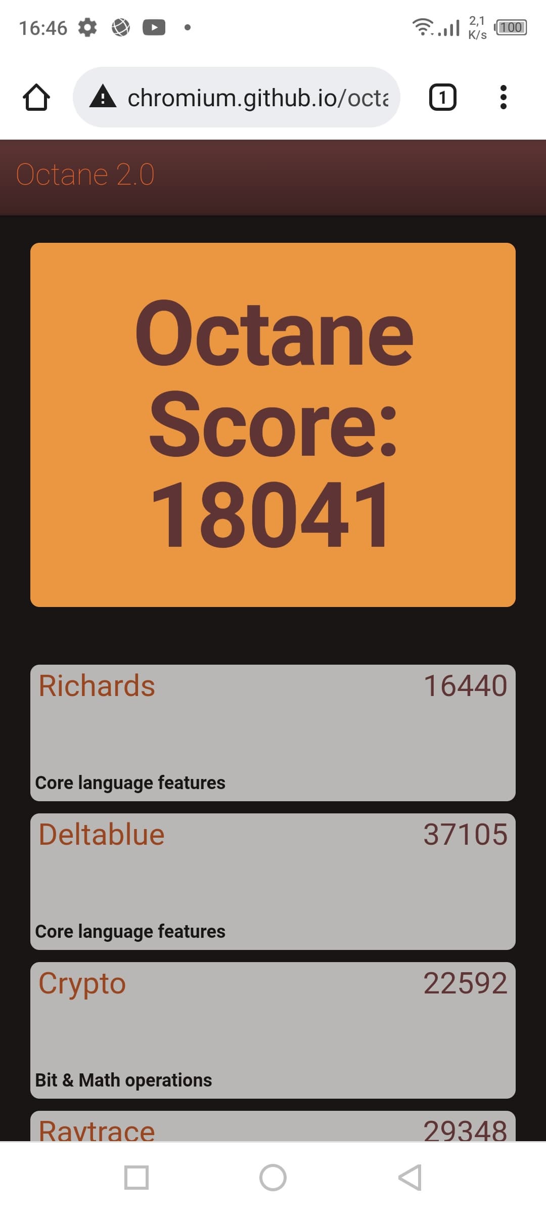 | Google Octane 2 (больше — лучше) | 18041 | 19887 | 19928 | 16670 | 16378 |