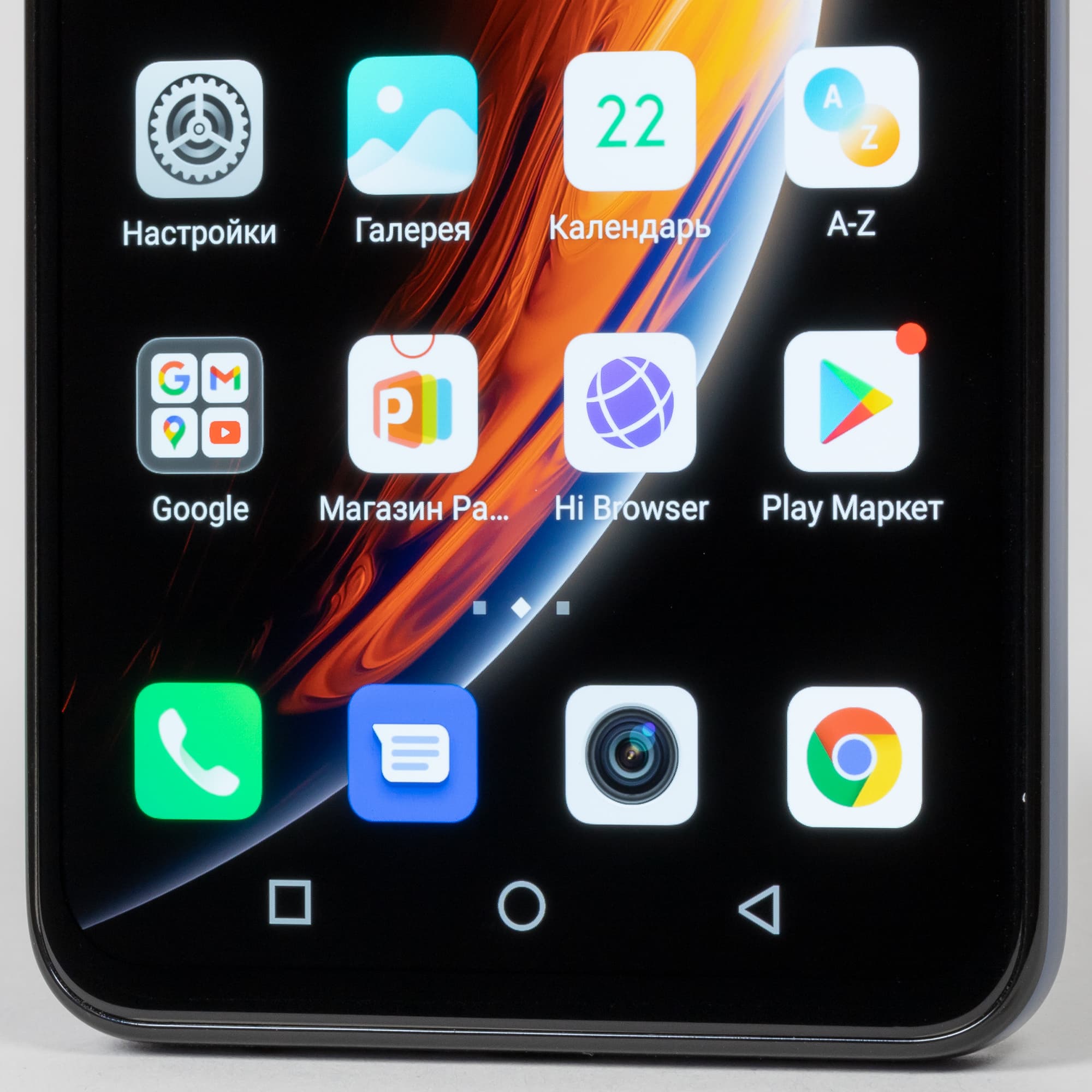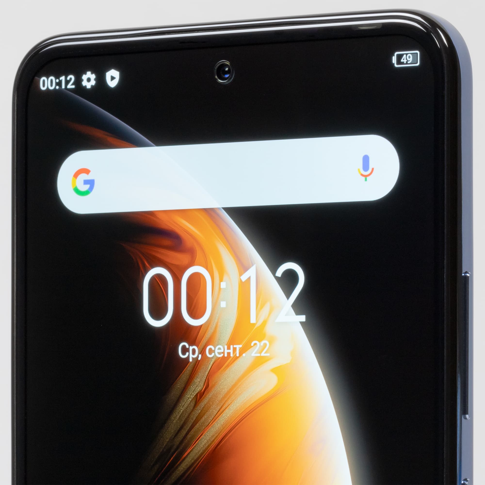 Фронтальная камера установлена за круглым вырезом в матрице дисплея. К сожалению, он расположен прямо по центру, а не убран в угол. Светодиодного индикатора событий нет.